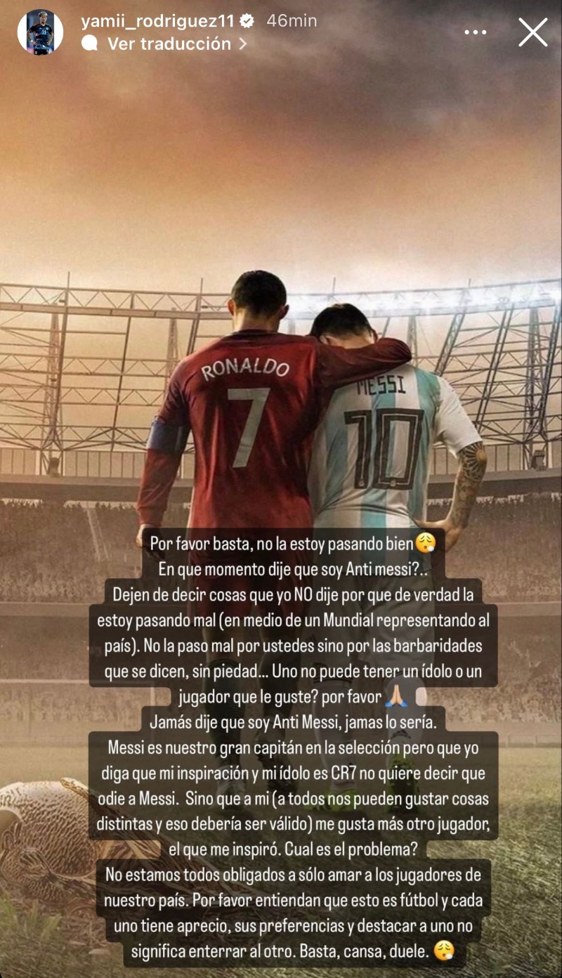 "Jamás dije que era anti-Messi, jamás lo sería. Messi es nuestro gran capitán de la Selección pero que yo diga que mi inspiración y mi ídolo es CR7 no quiere decir que odie a Messi, si no que a mí me gusta más otro jugador, el que me inspiró. ¿Cuál es el problema? A todos nos pueden gustar cosas distintas y eso debería ser válido", continuó Yamila en su historia en Instagram junto con una foto de Lionel Messi abrazando a Cristiano Ronaldo.