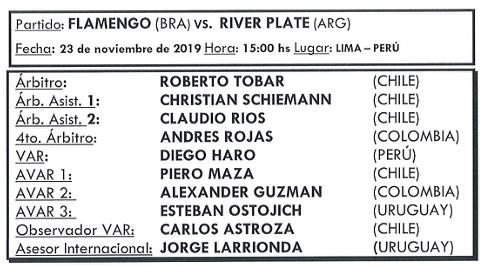 Ahora, la organización de la Copa Libertadores confirmó los nombres de los árbitros que estarán encargados de impartir justicia en el partido. El árbitro principal será el chileno Roberto Tobar, conocido por todos los clubes y en especial por el Millonario ya que fue el mismo que dirigió la ida en la final ante Boca el año pasado. Ante River, Tobar dirigió cinco partidos oficiales con 3 victorias y dos empates para el conjunto argentino.