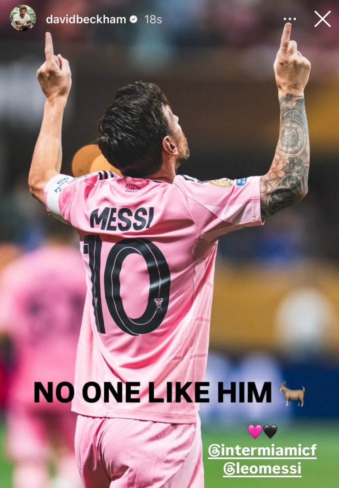 "Nadie como él", expresó el ex futbolista inglés, uno de los dueños de Inter Miami, mediante su cuenta oficial de Instagram, acompañada por una foto del festejo del astro rosarino. Para el capitán de la Selección Argentina, fue su primer gol en el torneo.