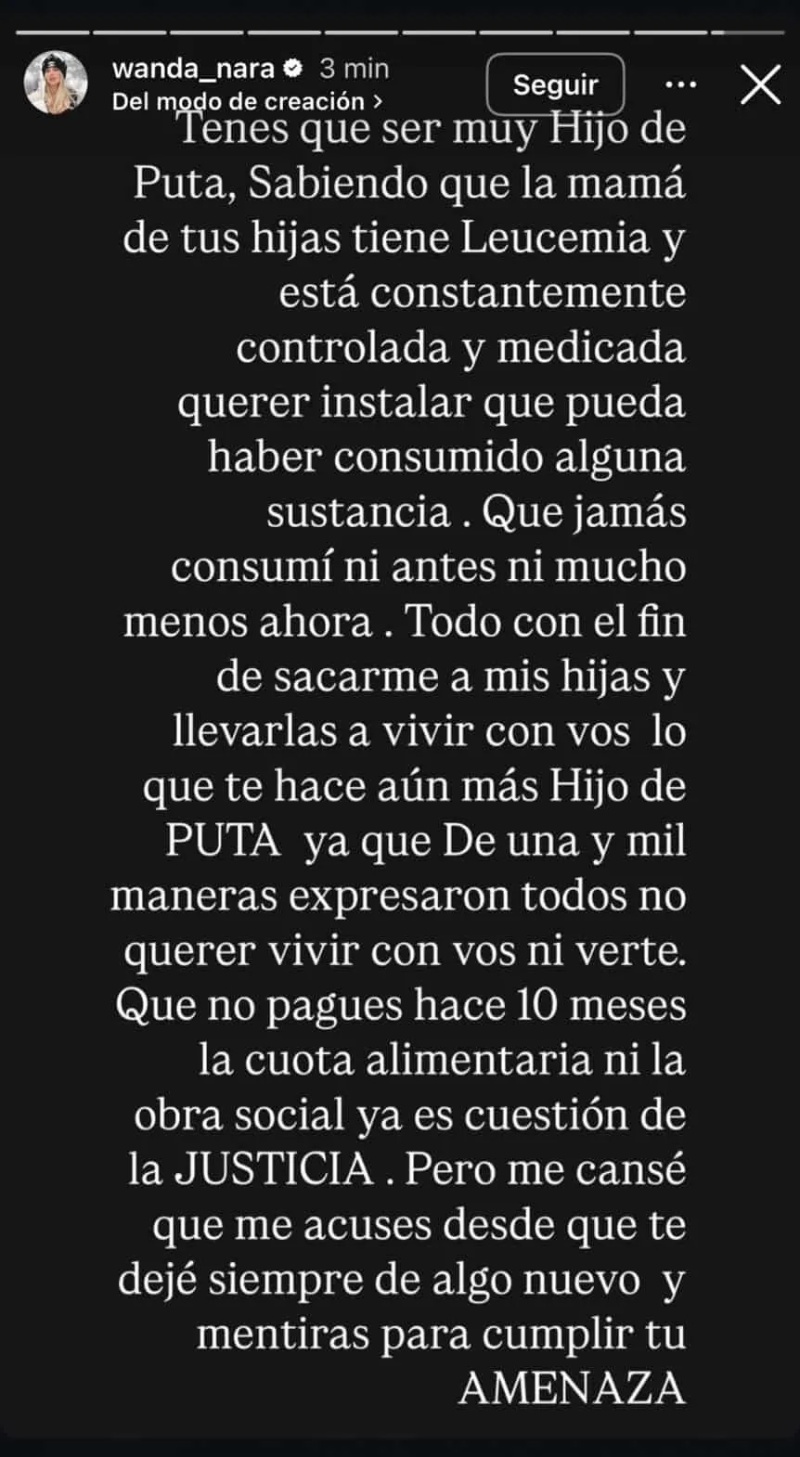 "Tenés que ser muy hijo de puta, sabiendo que la madre de tus hijas tiene leucemia y está constantemente controlada y medicada, para querer instalar que pude haber consumido alguna sustancia que jamás consumí", inició.