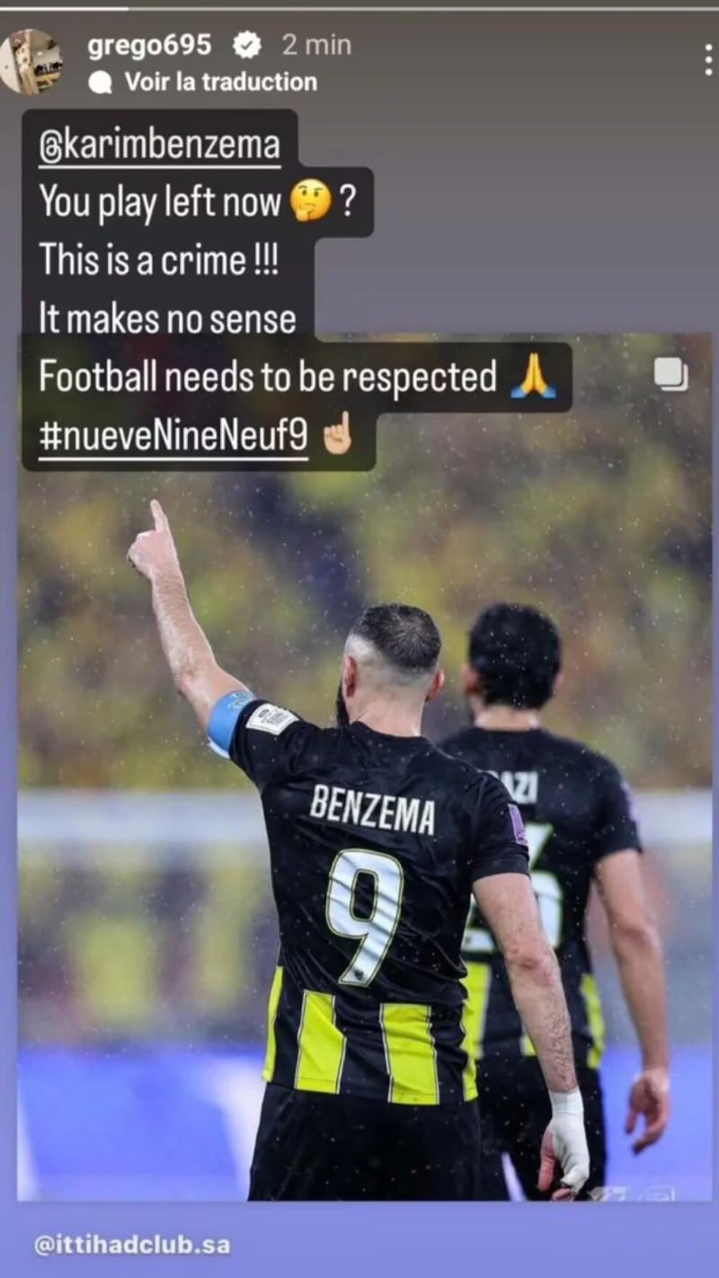 "¿Ahora juegas con Karim por la izquierda? ¡Esto es un crimen! No tiene sentido. El fútbol necesita ser respetado", afirmó a través de su cuenta de Instagram, acompañado por una imagen del ex Real Madrid en un encuentro del Al-Ittihad.