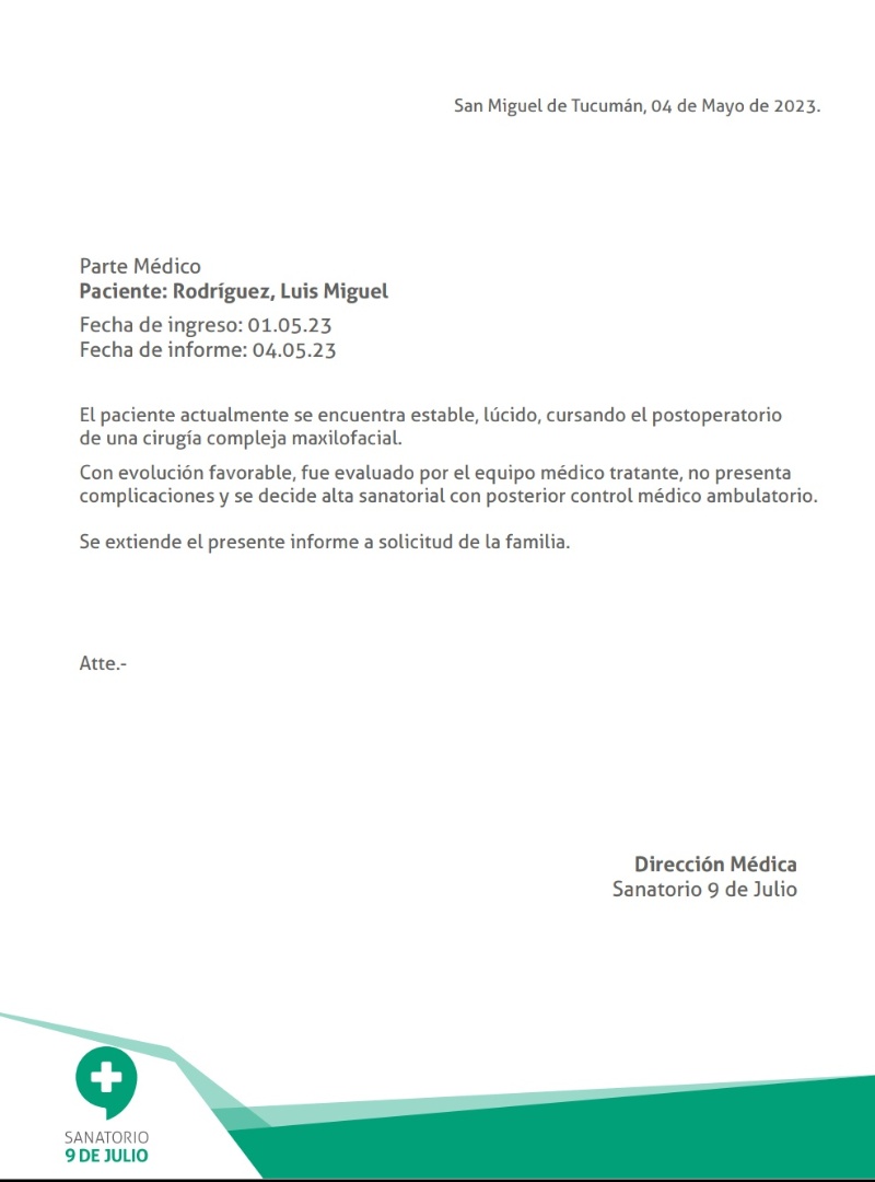 "El paciente actualmente se encuentra estable, lúcido, cursando el postoperatorio de una cirugía compleja maxilofacial. Con evolución favorable, fue evaluado por el equipo médico tratante, no presenta complicaciones y se decide alta sanatorial con posterior control médico ambulatorio. Se extiende el presente informe a solicitud de la familia", manifestaron desde el Sanatorio 9 de Julio.