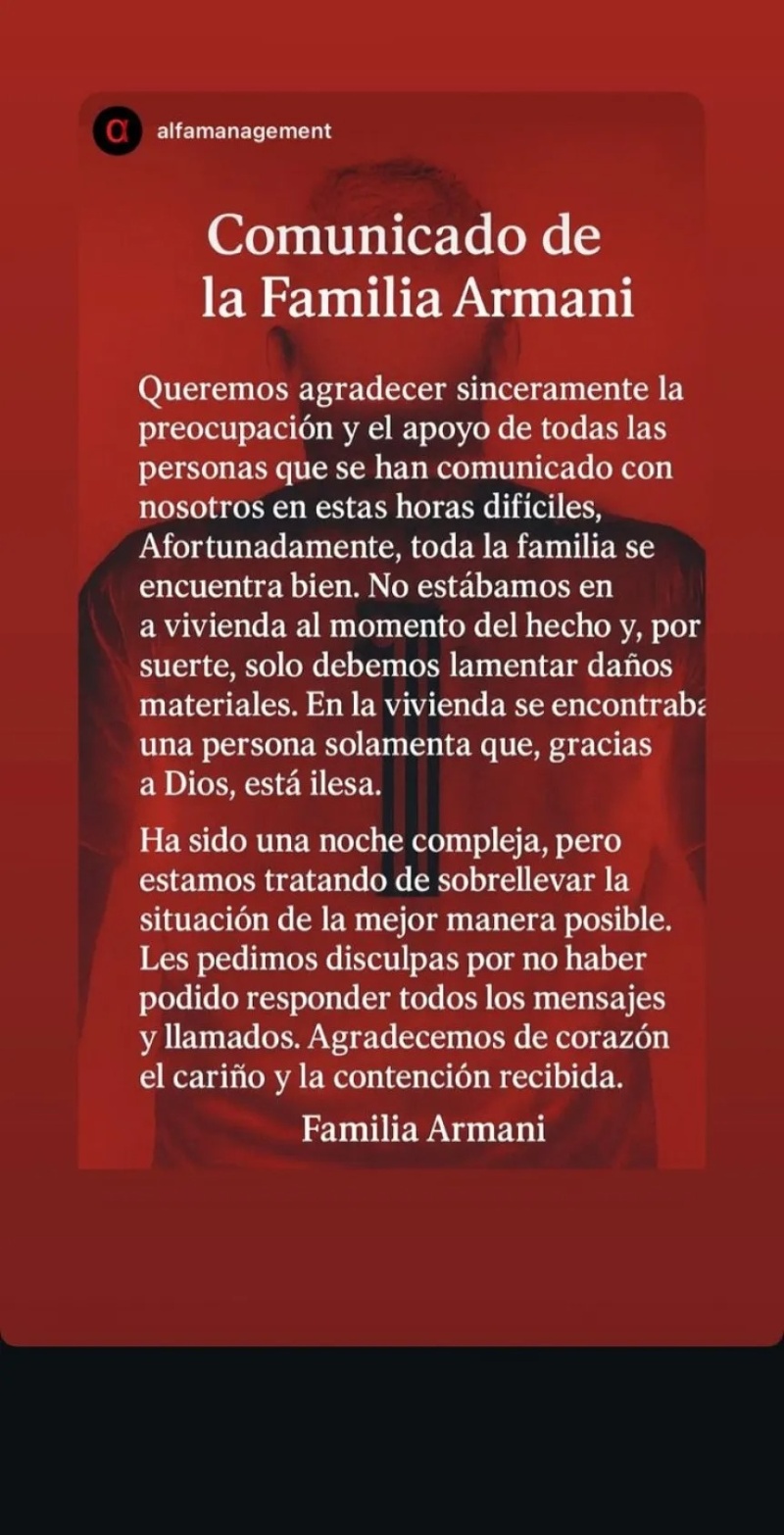 El comunicado de Armani tras la explosión en Ezeiza que afectó su casa