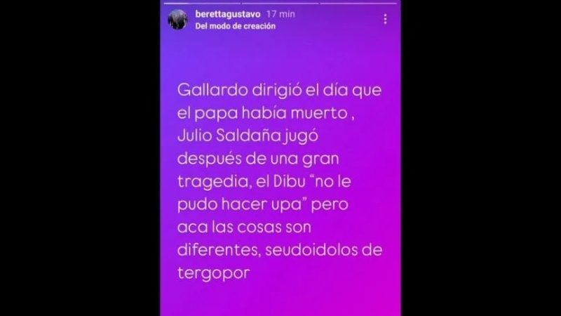 "Gallardo dirigió el día que el papá había muerto, Julio Saldaña jugó después de una gran tragedia, el Dibu "no le pudo hacer upa", pero acá las cosas son diferentes, pseudo ídolos de telgopor", escribió el dirigente.