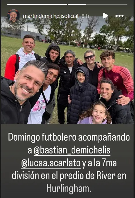 "Qué felicidad verte jugar con la camiseta de River hijo", escribió primero Demichelis con una foto de Bastian enfrentando a Vélez. Y completó poco después de la derrota del Millonario ante Sarmiento. "Domingo futbolero acompañando a Bastián Demichelis, Luca Scarlato y la Séptima División en el predio de River de Hurlingham”, puso Micho. Y aunque obviamente no hizo mención al equipo de Marcelo Gallardo, su aparición dio bastante para hablar.