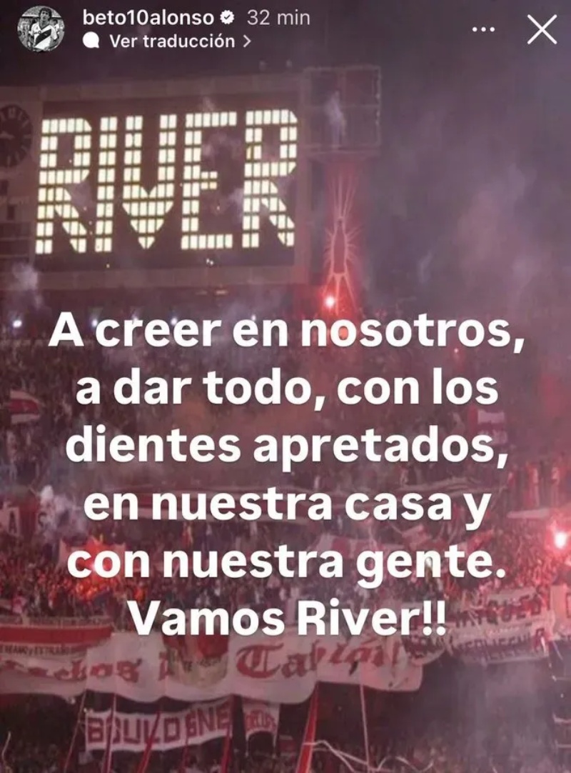 "A creer en nosotros. A dar todo, con los dientes apretados, en nuestra casa y con nuestra gente. Vamos River", expresó el Beto, uno de los grandes ídolos de la institución, junto con una postal de un antiguo recibimiento en el Monumental.