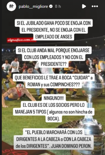 A través de su cuenta de Instagram, Pablo Migliore subió dos historias responsabilizando a Juan Román Riquelme por el complicado momento de Boca.