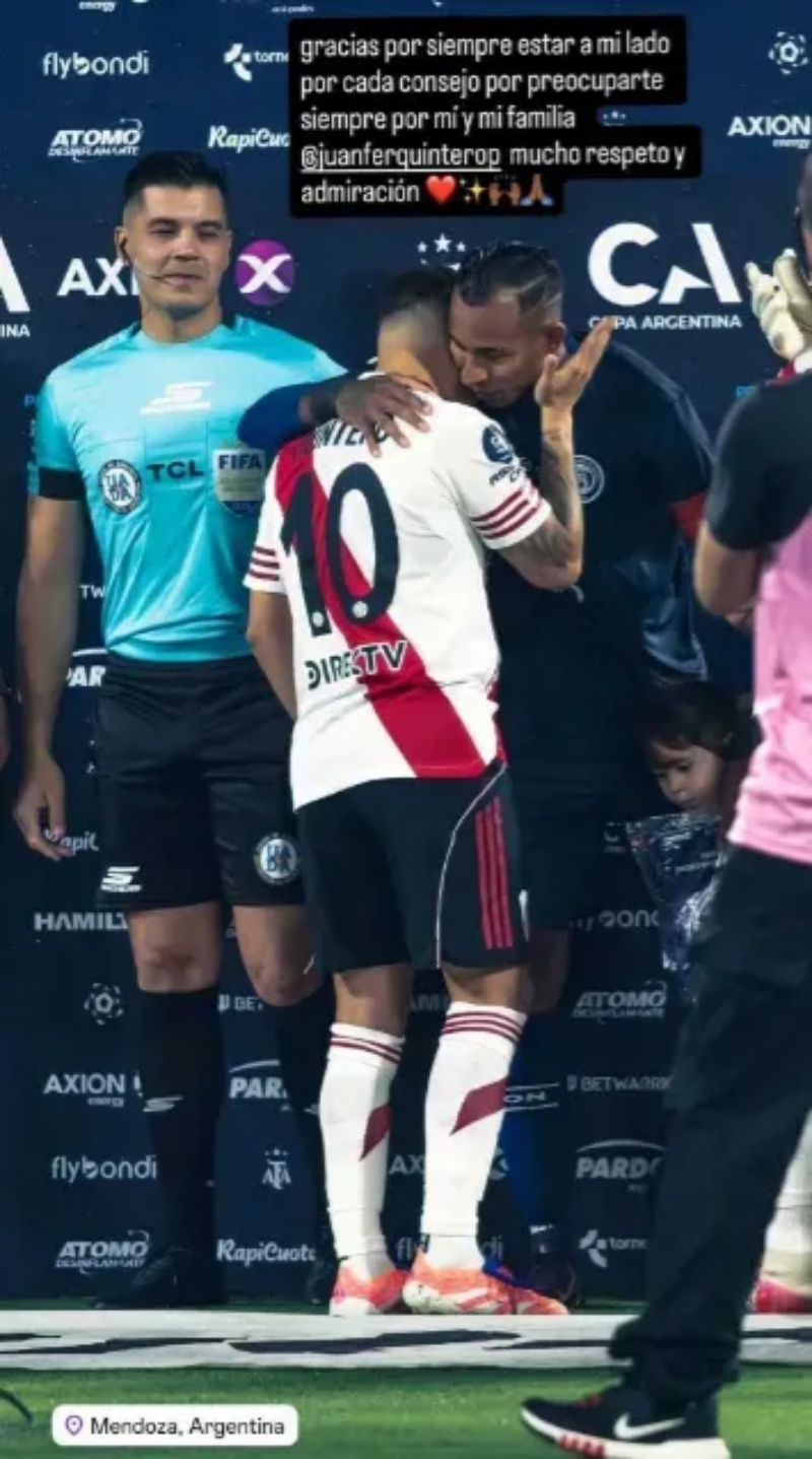 Y luego, acompañado por una foto de ambos abrazos en la previa del partido entre River e Independiente Rivadavia, completó: "@juanferquinterop mucho respeto y admiración". Cabe recordar que desde hace varios años que son íntimos amigos.