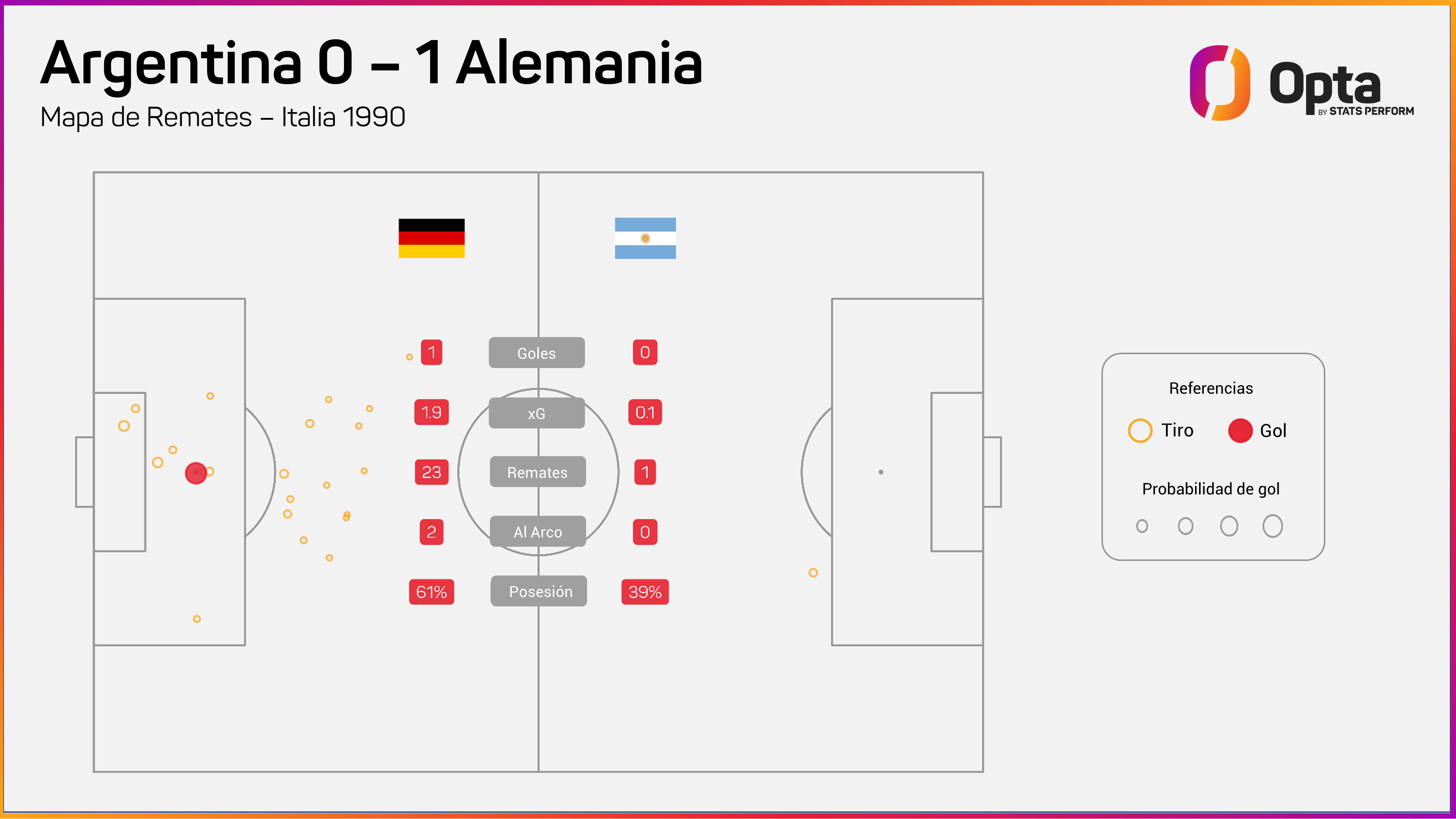 Con un equipo disminuido por lesiones y suspensiones, el equipo de Bilardo salió a defenderse ante Alemania, apostando por una nueva noche heroica de Goycochea. Durante los 90 minutos hubo solo un remate de la Albiceleste (0.1 xG) contra 23 (1.9 xG) de los germanos, que sin embargo solo consiguieron anotar a partir de un dudoso penal en el minuto 85, convertido por Andreas Brehme.
